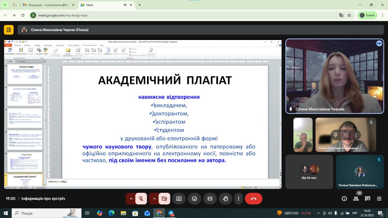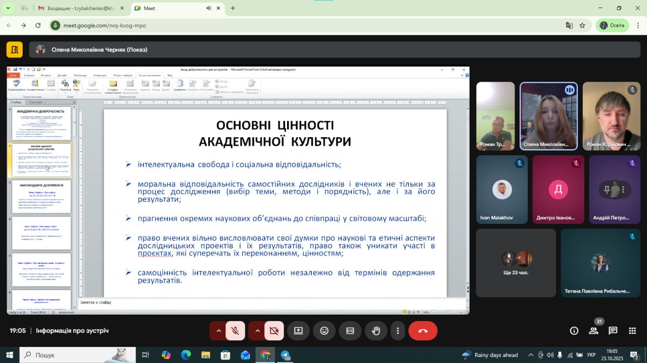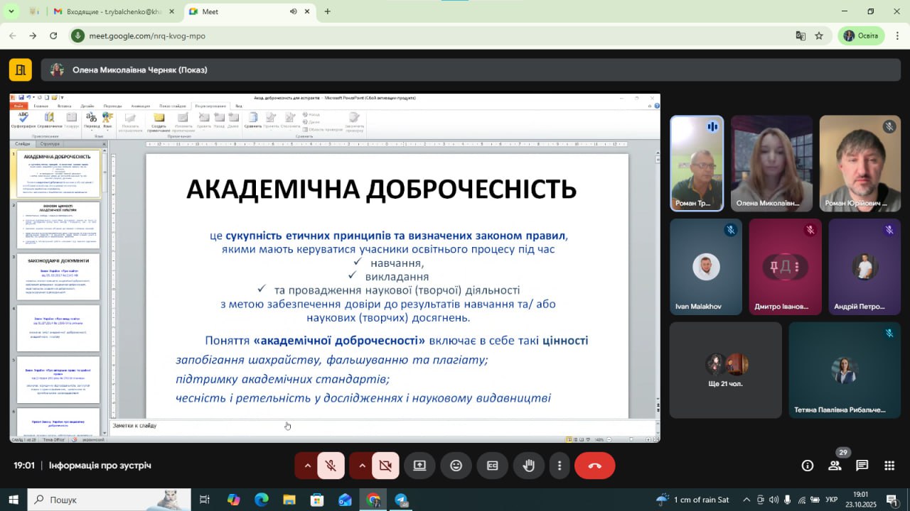 223.10.2025 до Міжнародного дня академічної доброчесності який відзначається 21 жовтня, на кафедрі 305 було проведено семінар на тему: «Академічна доброчесність». На семінарі було розглянуто питання забезпечення академічної доброчесності в освітньо-науковому просторі, а саме: законодавче підґрунтя; нормативні документи ХАІ, що регулюють питання академічної доброчесності; порядок дій при виявлені фактів порушення академічної доброчесності; академічні можливості щодо перевірки доробків на плагіат та інше.