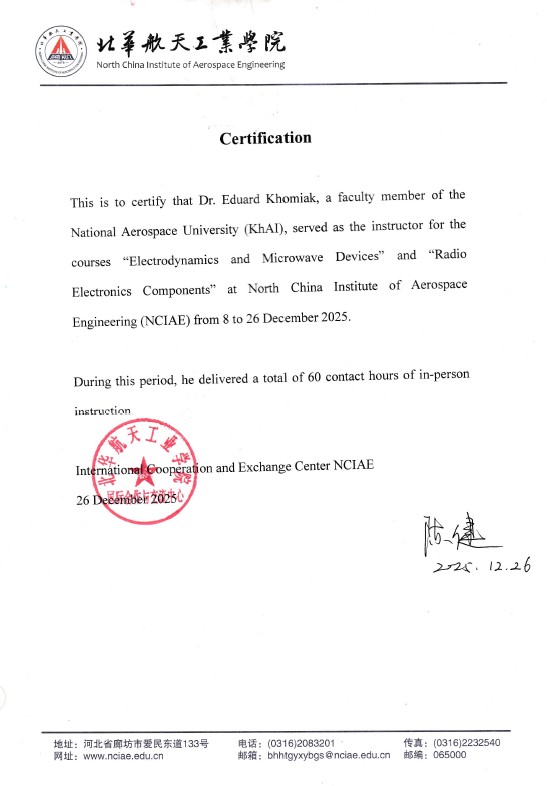 У грудні 2025 року відбулася важлива подія в межах розвитку міжнародної академічної співпраці — викладач Національного аерокосмічного університету «ХАІ», PhD Едуард Хом’як, провів навчальні курси в North China Institute of Aerospace Engineering (Китай). У період з 8 по 26 грудня 2025 року було реалізовано інтенсивну освітню програму, що включала викладання дисциплін «Electrodynamics and Microwave Devices» та «Radio Electronics Components». Загальний обсяг аудиторної роботи склав 60 годин очного навчання, що свідчить про високий рівень залученості та академічної взаємодії.