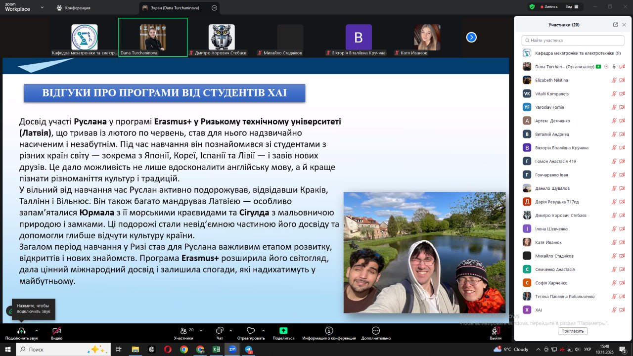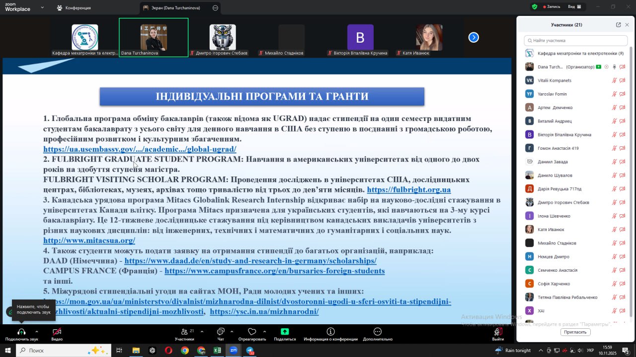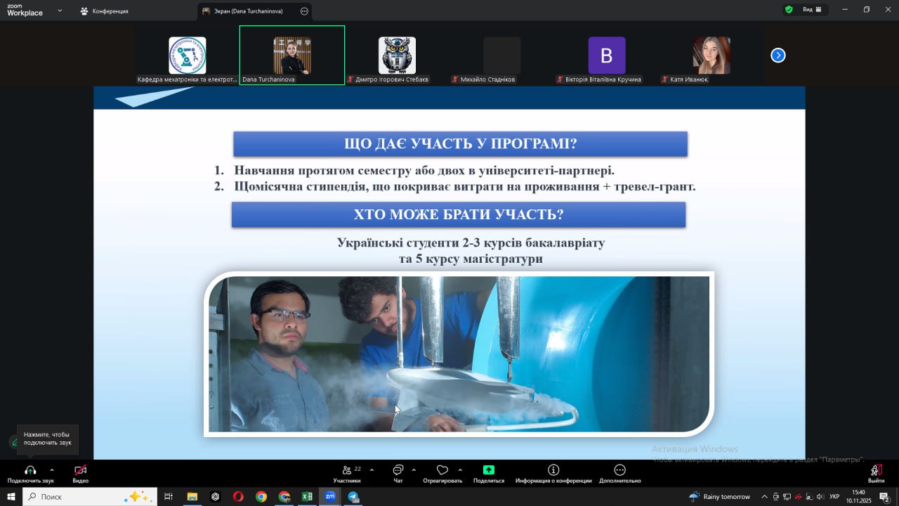 Під час зустрічі обговорювалися питання: участі у програмах Erasmus+, Horizon Europe, Marie Skłodowska-Curie Actions; DAD; оформлення документів для подання на академічну мобільність; підготовки дослідницьких планів і рекомендаційних листів; мовних та культурних аспектів перебування в університетах-партнерах.