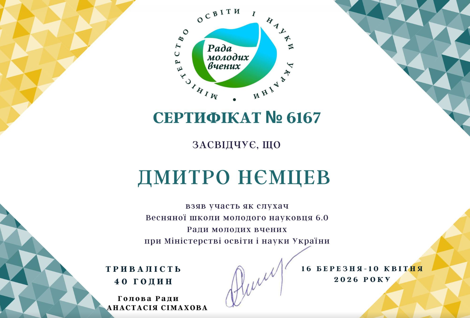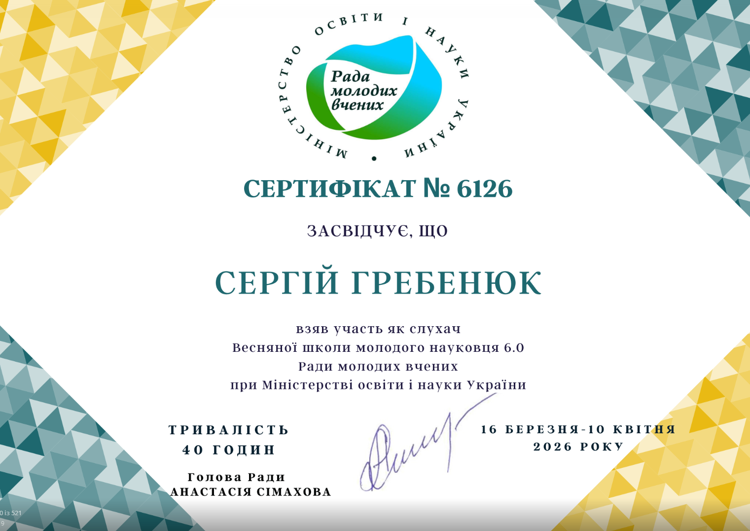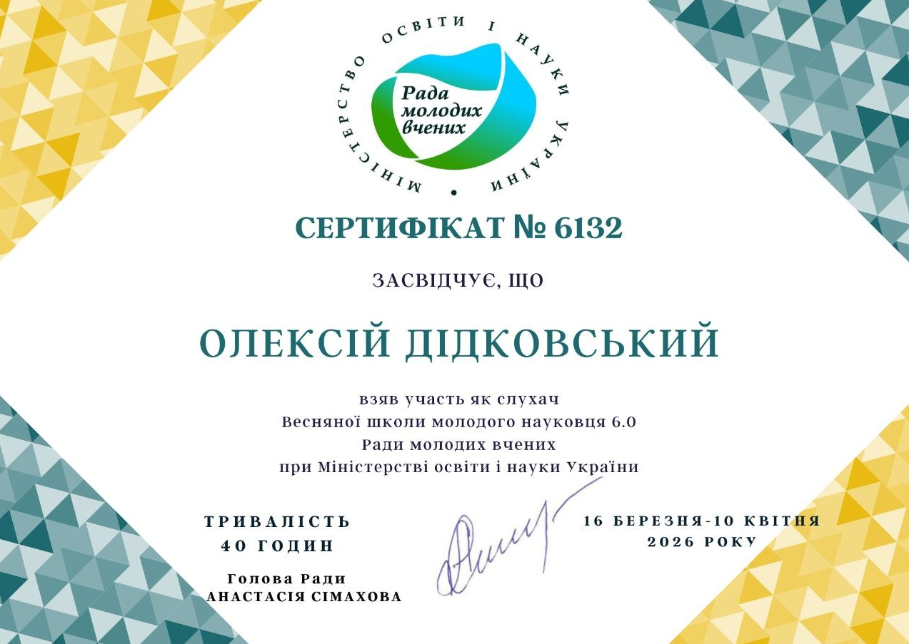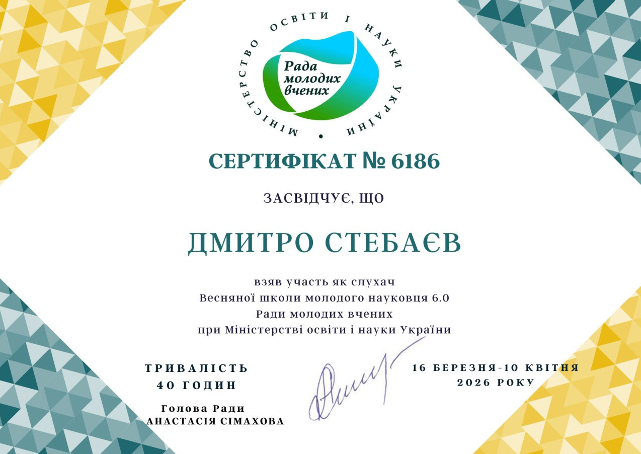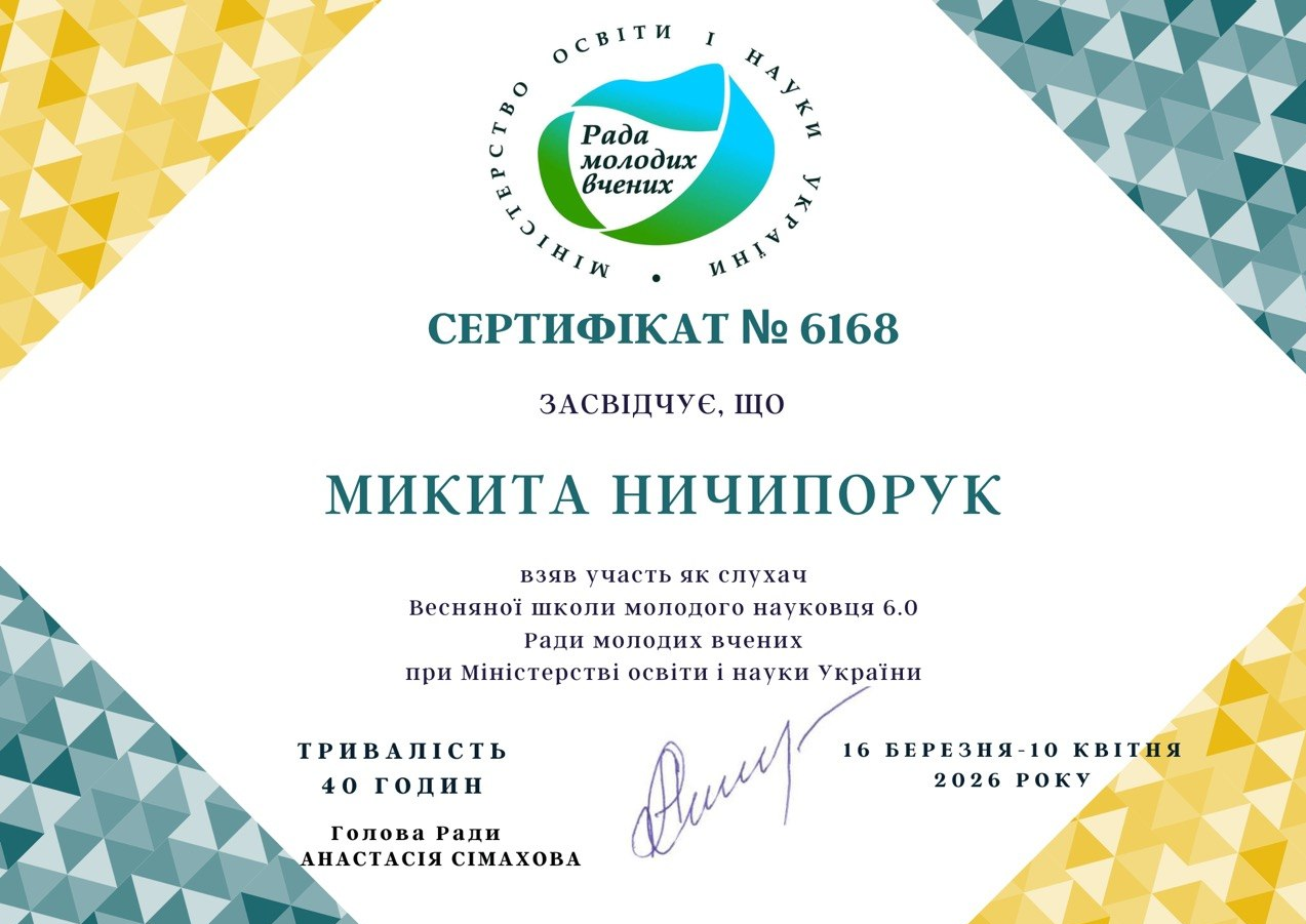 Аспіранти успішно пройшли навчання у межах Весняної школи молодого науковця 6.0, що проводилася з 16 по 20 березня 2026 року в онлайн-форматі на платформі Zoom. Програма Школи була спрямована на підвищення якості наукових досліджень, розвиток професійних компетентностей молодих учених, а також формування навичок ефективної науково-дослідної та аналітичної діяльності в умовах сучасних викликів.