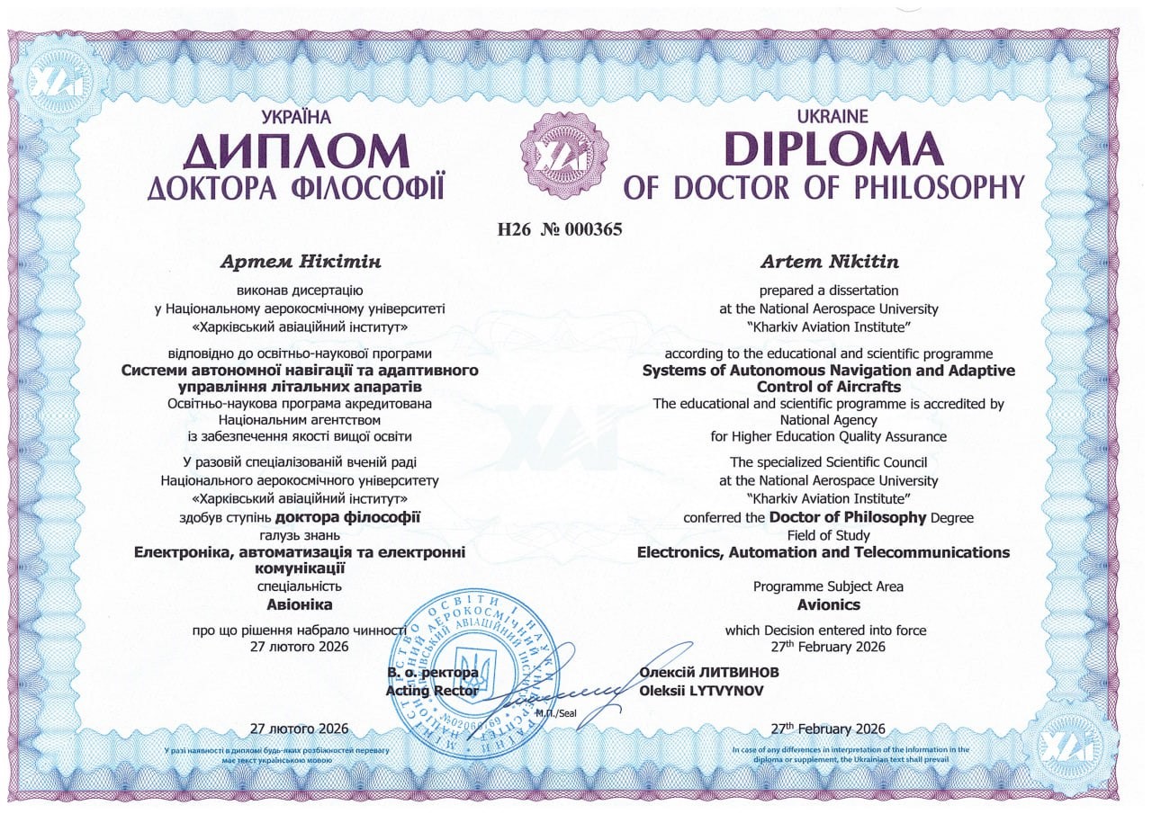 Захист пройшов у змішаному форматі. Після обговорення разова спеціалізована вчена рада ухвалила рішення присудити Артему Нікітіну ступінь доктора філософії у галузі 17 «Електроніка, автоматизація та електронні комунікації» за спеціальністю 173 «Авіоніка».