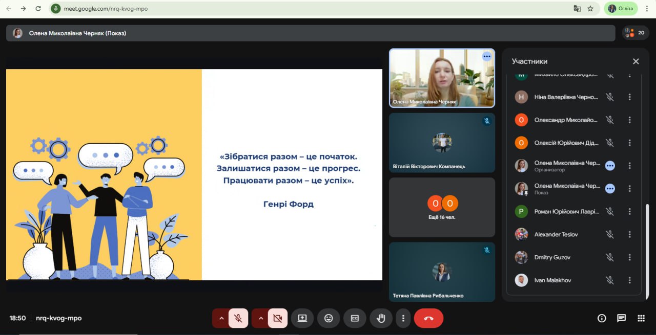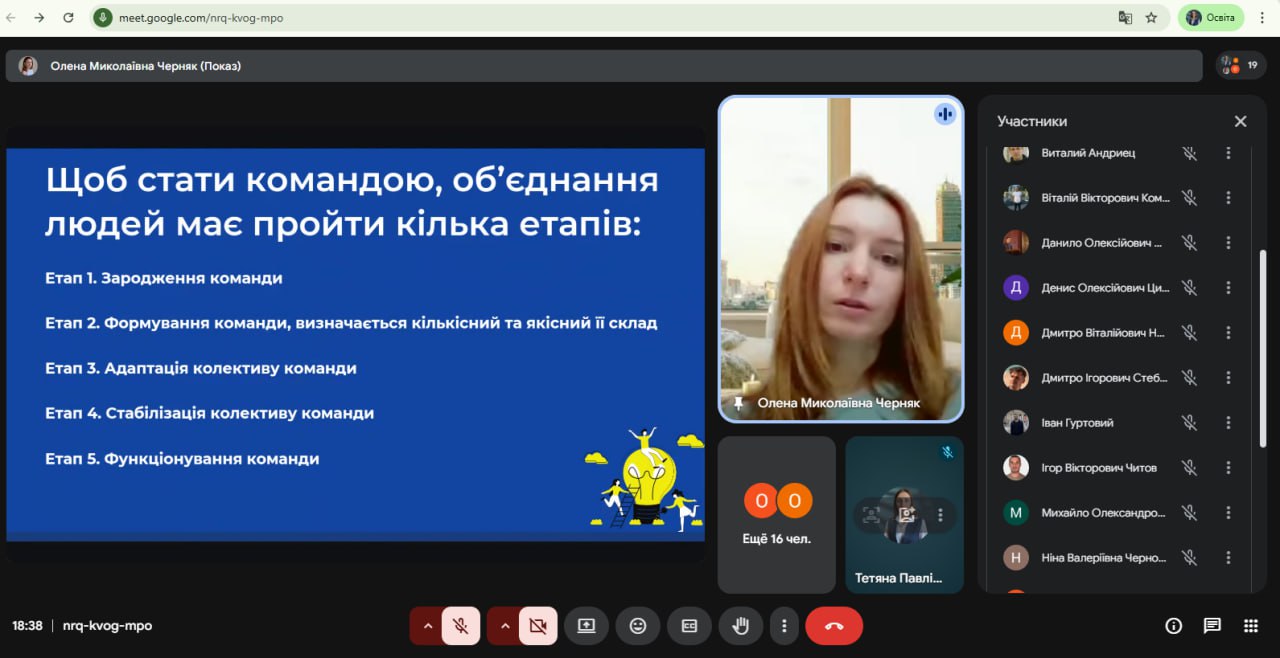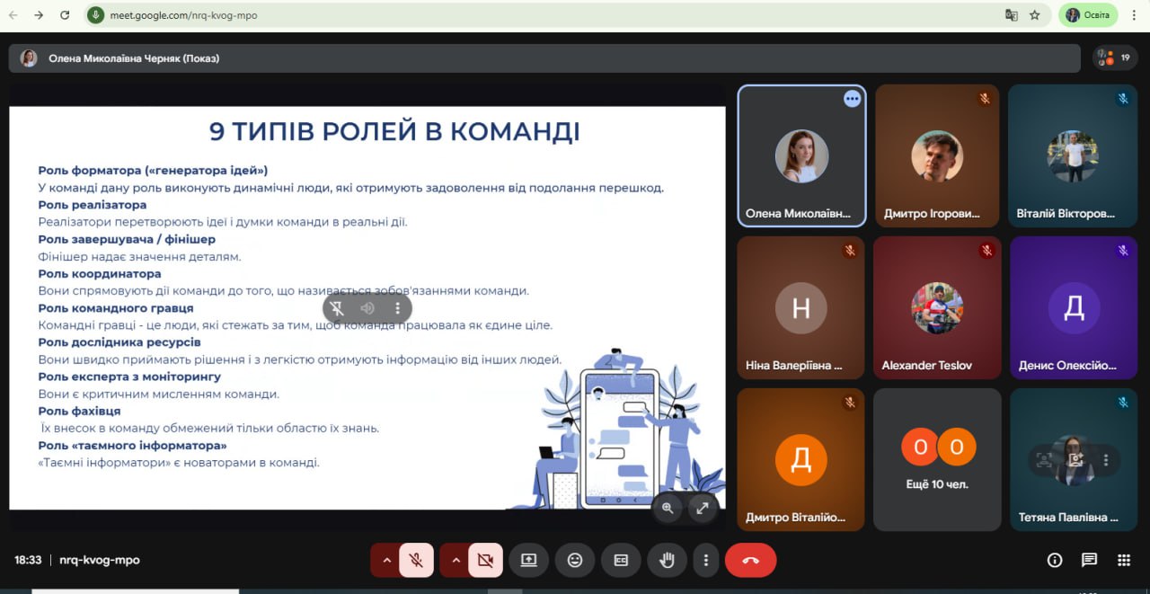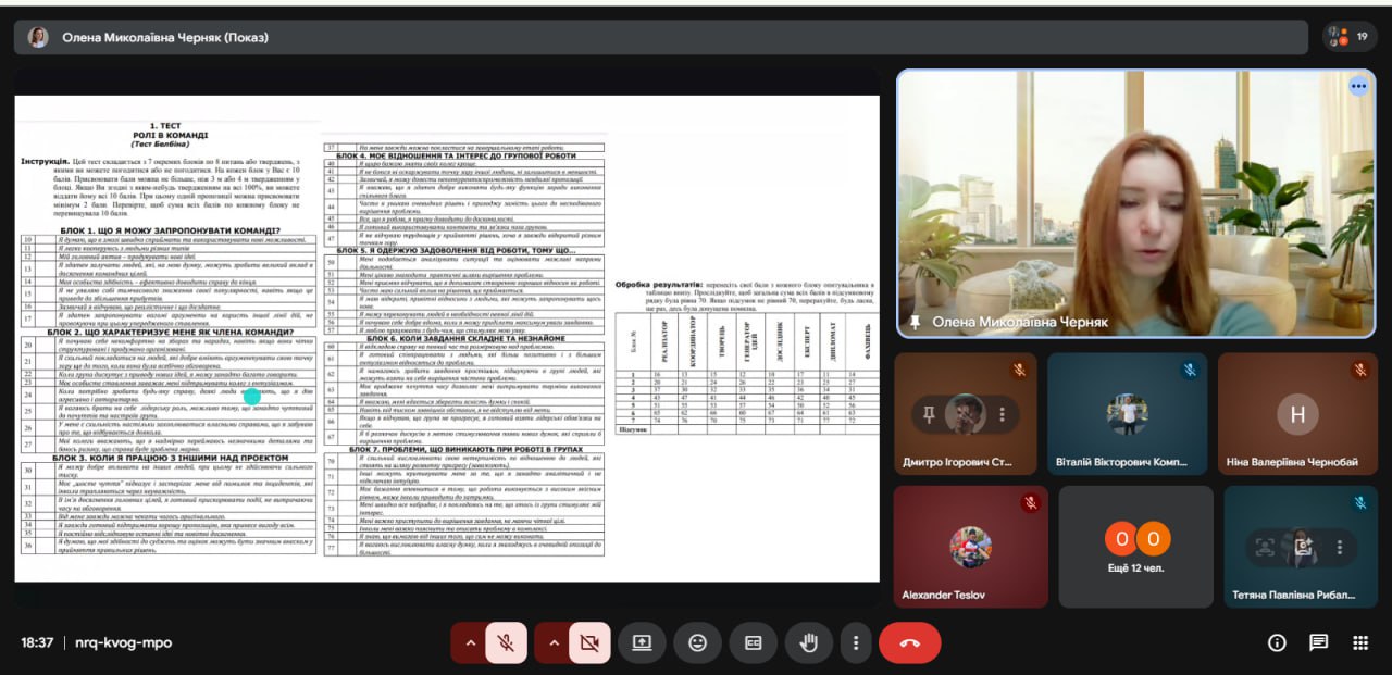 Під час семінару було розглянуто ключові аспекти ефективної командної взаємодії в освітній та науковій діяльності. Учасники обговорили роль командної роботи в реалізації наукових і освітніх проєктів, особливості розподілу ролей у команді, а також важливість комунікації, довіри та відповідальності між її учасниками.